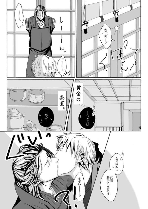 黄金の茶室っていうのは、昔大河「秀吉」で、なんかそういうシーンがあったんでそれを思い出して…意外とここ人来ないんじゃないの?!とか。確かあの時は石田三成と茶々だったような気がする…。畳んどきゃいいのに、もったいないし~ってことで、人があんまり来ない広い場所にいつもは飾ってあるとかさ…(妄想)。エロい(笑)。